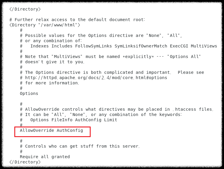 step 1) AllowOverride 지시자의 옵션값 변경 (None -> AuthConfig 또는 All)